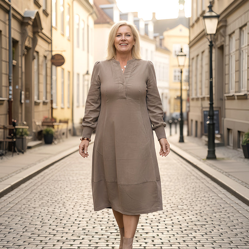 DOORDACHTE DETAILS: De knoopsluiting aan de voorkant zorgt voor een vleugje klassieke elegantie, terwijl de twee ruime zijzakken praktisch gebruiksgemak bieden zonder afbreuk te doen aan de strakke lijnen van de jurk.