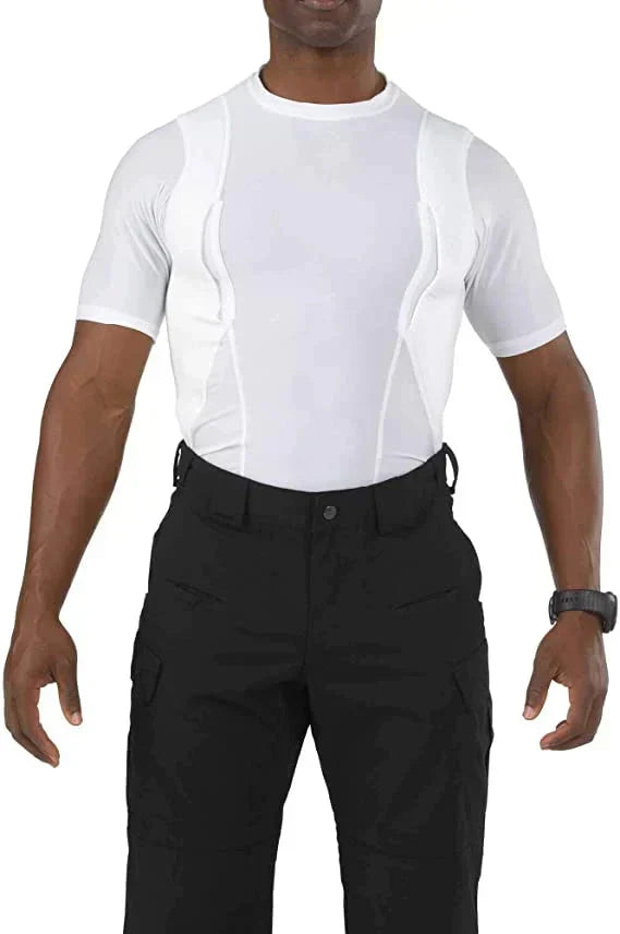 De holster is compatibel met de meeste handvuurwapens en beschikt over een veilig bevestigingssysteem om uw vuurwapen op zijn plaats te houden. Gewatteerde mesh-lagen voorkomen doorhangen en verbergen het profiel van uw pistool of revolver onder vrijwel elke kleding. Veel extra ruimte voor magazijnen, telefoon, kleine elektronica, pepperspray, LVAD of andere persoonlijke uitrusting voor gebruik bij sport, undercoverwerk, politie, leger, gevechts-, aanvals- en geheime operaties! T-shirt met korte mouwen ZIET ER GEWELDIG UIT EN VOELT HEERLIJK AAN, zowel binnen als buiten, onder uw overhemd, T-shirt of trui!