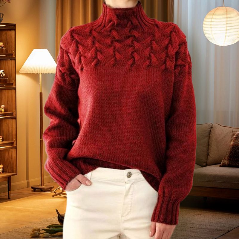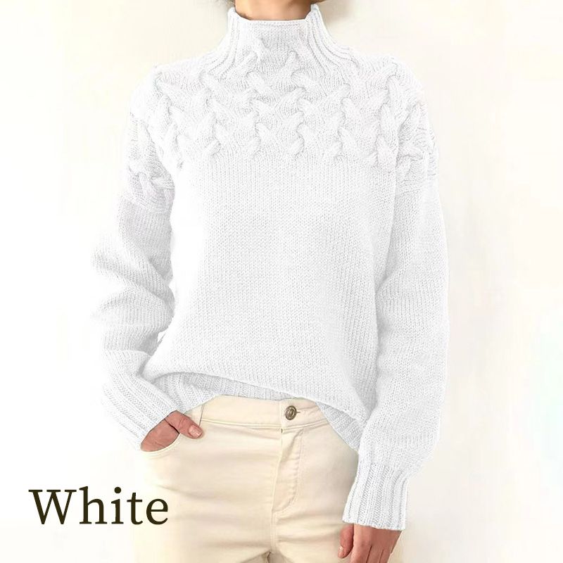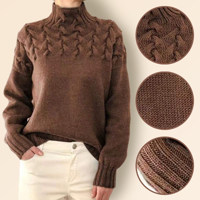 De unieke breitechniek in combinatie met de hoge kraag in een effen kleur straalt verfijnde en intellectuele elegantie uit, of je het nu alleen draagt of onder een jas, waardoor je er stijlvol en chic uitziet.